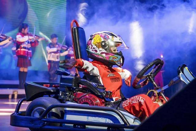 演出在弦乐模拟的引擎呼啸声中开始。随着节奏加强,舞者们以充满力量感的动作勾勒出极速竞逐的线条。当节目进入高潮,真正的“主角”——一辆卡丁车在舞者的操控下平稳而精准地驶上舞台,这位身兼舞者与车手的表演者正是日前在嘉定区阳光体育大联赛卡丁车比赛中折桂的陈紫祎。
