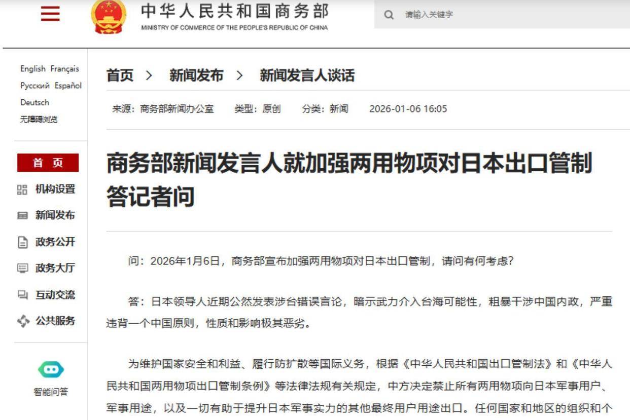 中方这次的回应来得很快。 就在高市早苗说完要对话后不到二十四小时,中国商务部发布了那份引人关注的公告。 公告内容很明确,就是要禁止所有两用物项向日本军事用户出口,也不允许这些物项用于日本的军事用途。