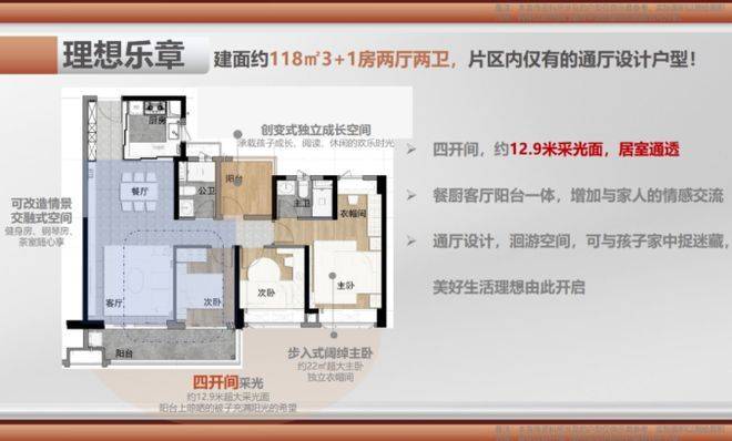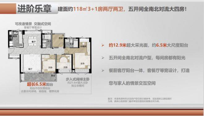118㎡的两个户型都具备出色的采光和空间设计。四面南向面宽,保证了充足的阳光照射,让室内各个角落都充满温暖。L 型大阳台不仅增加了室内的采光面,还为业主提供了一个休闲观景的好地方,可摆放桌椅,享受阳光与户外景色。